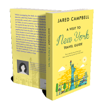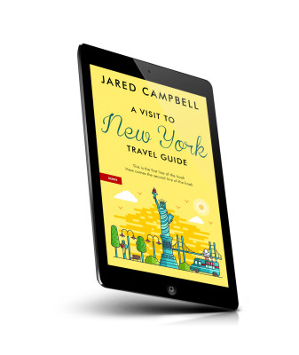 “A bright yellow travel guide cover featuring the Statue of Liberty, clouds, and city elements like a bridge and a food truck.”