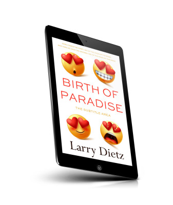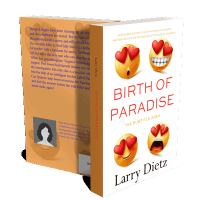 “Four emoticons with various expressions above and below the book title "Birth of Paradise" by Larry Dietz.”