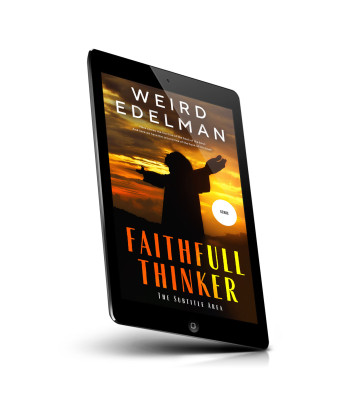 “A silhouetted figure with outstretched arms against a dramatic sunset sky. "FAITHFULL THINKER" in bold letters beneath.”