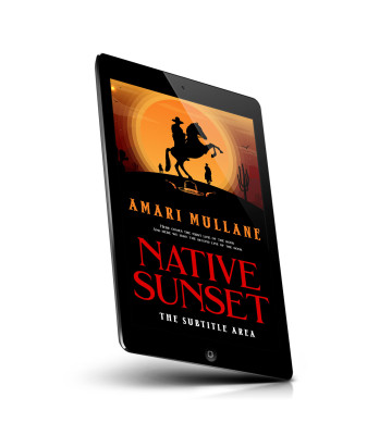 “Silhouette of a cowboy on a rearing horse against an orange sunset backdrop with cacti and another figure.”