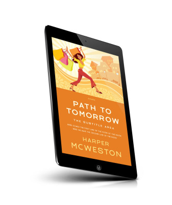 “A stylish woman with shopping bags walks joyfully in a lively cityscape. Below, the book cover displays title and author's name in bold text.”
