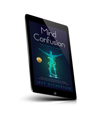 “A book cover with a glowing human figure, green dots, and DNA strands on a dark background. The title is "Mind Confusion."”