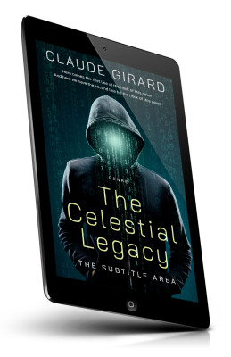 “A hooded figure with a glowing face amidst digital code. Dark, mysterious vibe. Book title: The Celestial Legacy.”