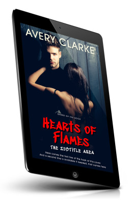 “A man and woman embrace passionately in dim lighting. The book title is in red with a dark, moody background.”