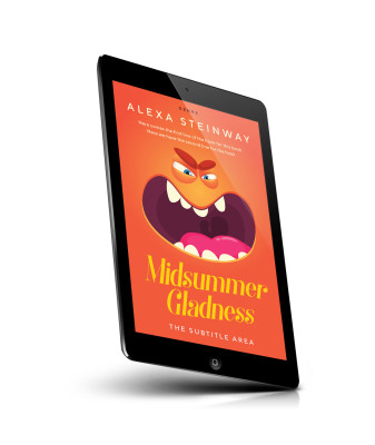 “A cartoonish, angry face with a large open mouth is featured above the title "Midsummer Gladness" on a bright yellow and orange book cover.”