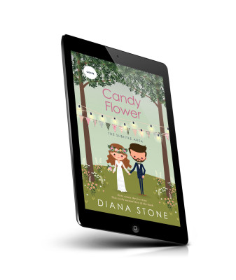 “A whimsical illustration of a bride and groom in a garden setting with lights and bunting, surrounded by flowers and greenery.”