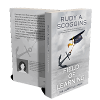 “An anchor tied to a graduation cap is floating in a cloudy sky above the text "Field of Learning".”