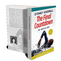 “A swimmer in goggles and a swim cap mid-stroke against a watery backdrop. Book title and author name appear prominently above.”