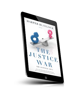 “A seesaw with male and female symbols in balance; title reads "The Justice War", author is Harper Blaylock. Clean, minimalist design.”