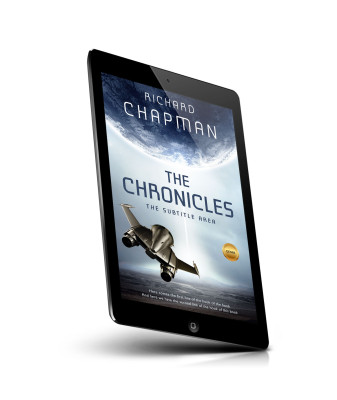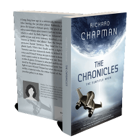 “A sci-fi book cover featuring a spaceship with a planet in the background, titled "The Chronicles."”