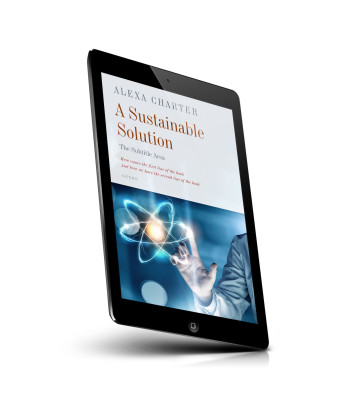 “A book cover with a hand and a glowing atom illustration, featuring the title "A Sustainable Solution" and the author's name, Alexa Charter.”