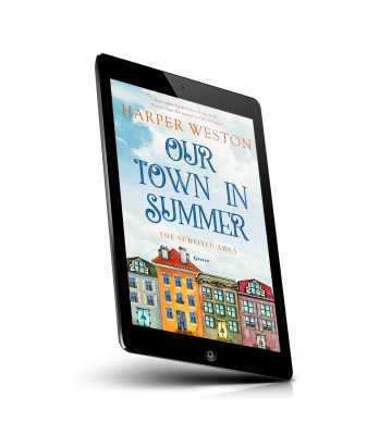 “Illustrated book cover with colorful houses under a cloudy sky.”