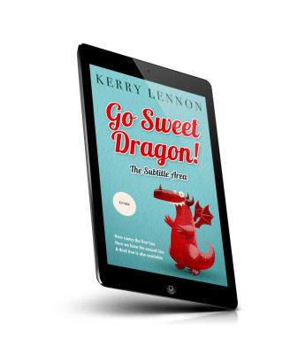 “A whimsical red dragon on a light blue background with decorative text above and a circular label on the left.”