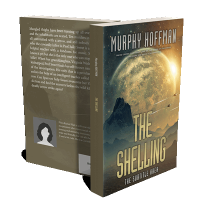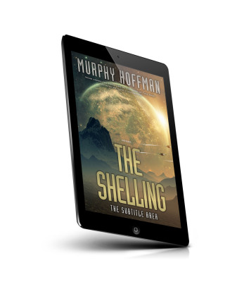 “A large, glowing planet looms over a rugged mountain landscape with spaceships flying. The book title "THE SHELLING" is prominent.”