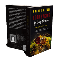 “Two glasses of wine surrounded by grapes on a wooden table with a book title above.”
