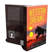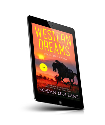 “Silhouette of a cowboy riding a horse against a sunset sky. Western vibe with bold yellow title text.”