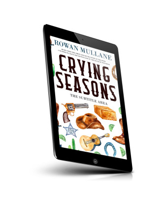 “Western-themed items like a revolver, cowboy hat, boots, guitar, and a stack of hay surround the title "Crying Seasons."”