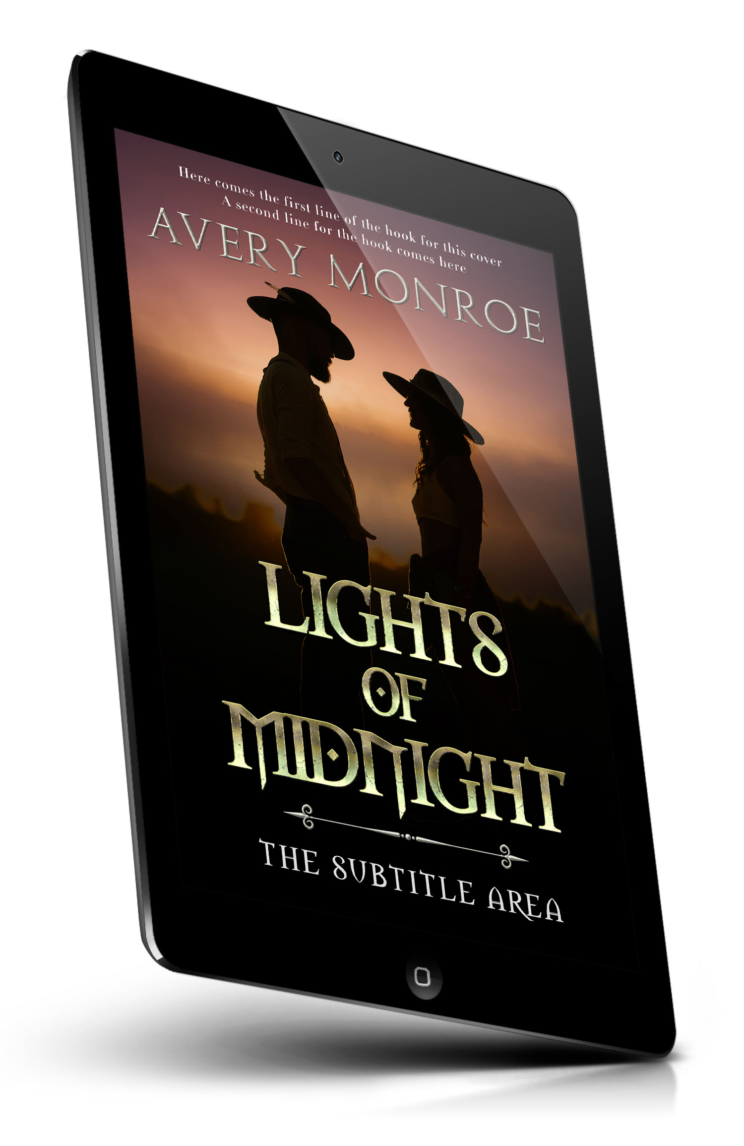 Tags: silhouette, romance, sunset, couple, western, mystery, shadows, nightfall, chemistry, horizon, love, hat, desert, scenery, twilight, connection, journey, enigma, reflection, sunlight, premade cover, book cover design, self-publishing, ebook cover, print ready