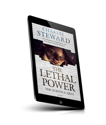 “A woman looks downward in a dimly lit setting; the background is a white brick wall with text about a book titled "The Lethal Power."”