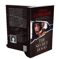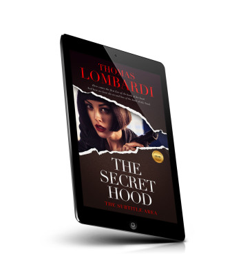 “A woman with dark hair holding a gun, set against a torn paper backdrop revealing text and title "The Secret Hood."”