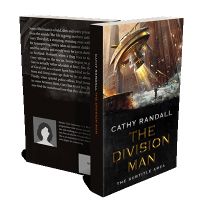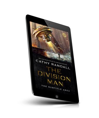 “A futuristic cityscape with a flying machine emitting light, figures below; book cover with title "The Division Man" by Cathy Randall.”