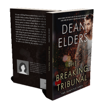 “A man stands in the background with a serious expression, surrounded by glowing particles. The title "The Breaking Tribunal" is prominent.”