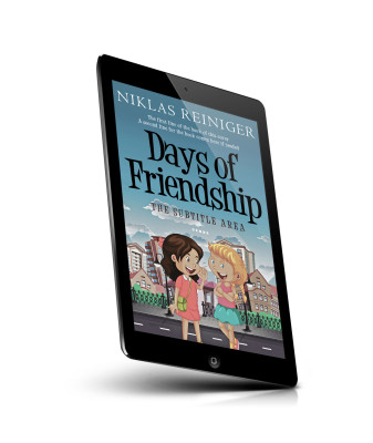 “Two girls chatting happily in front of buildings and a blue sky, with a book title and author name displayed above.”