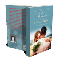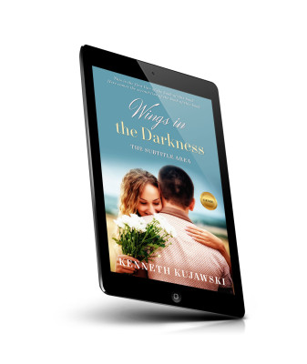 “A woman holding flowers embraces a man, with a serene outdoor backdrop. The cover features the title "Wings in the Darkness."”
