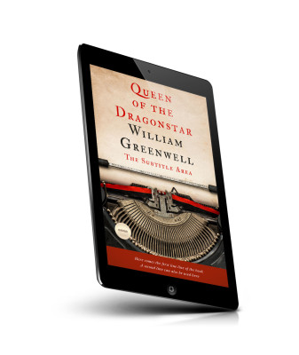 “Vintage typewriter with paper showing book title "Queen of the Dragonstar" by William Greenwell.”