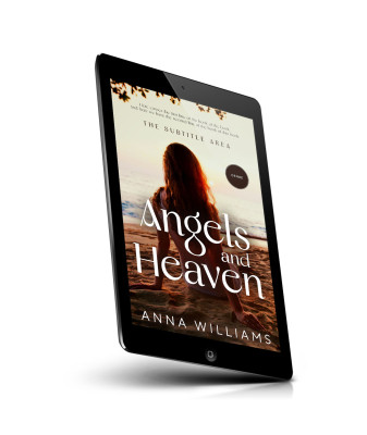 “A person sitting on a beach at sunset, facing the ocean, with the text "Angels and Heaven" by Anna Williams.”