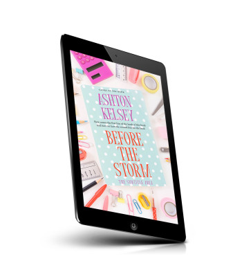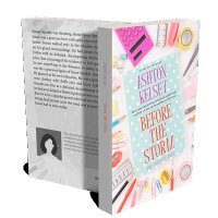 “A book titled "Before the Storm" lies atop a desk surrounded by colorful stationery tools like a calculator, ruler, and paper clips.”