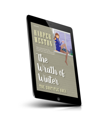 “Woman in blue dress seated by a window, holding a glass with a drink. Book cover design with title "The Wrath of Winter".”