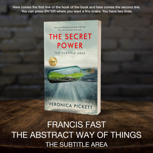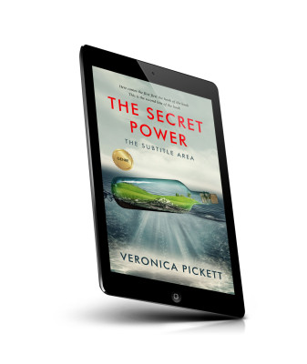 “A glass bottle floats in the ocean; inside, a landscape with green fields and a clear sky. The book is titled "The Secret Power."”