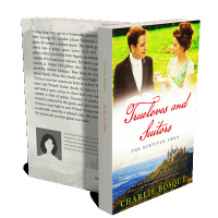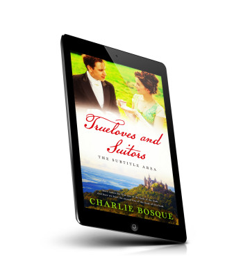 “A couple in vintage attire shares tea in a scenic, green landscape, while a distant castle sits on a hill under a blue sky.”