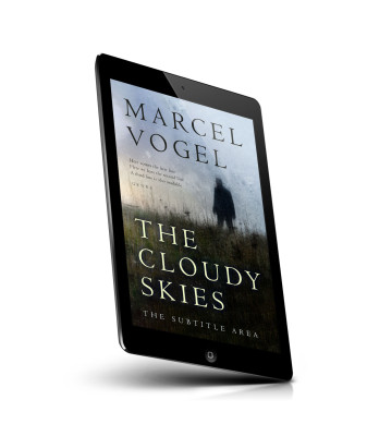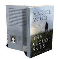 “A figure stands in a misty, grassy field under a cloudy sky. The title "The Cloudy Skies" is prominently displayed.”