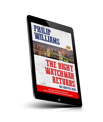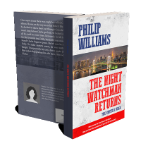 “A city skyline at night with bright lights is on a book cover titled "The Night Watchman Returns."”