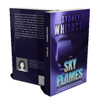 “A close-up of a statue or face with a purple and blue color scheme, featuring large text "SKY FLAMES."”