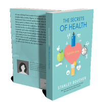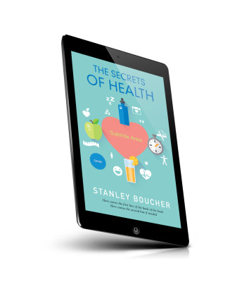 “A book cover titled "The Secrets of Health" with health-related icons like a water bottle, apple, stopwatch, and heart.”