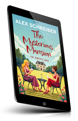 “Two women in elegant dresses enjoy tea at a garden table, with a stately house and trees in the background.”