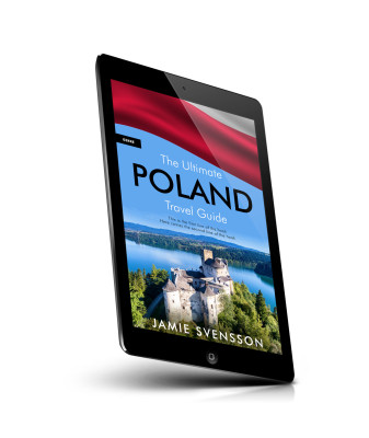 “A travel guidebook cover with a scenic view of a castle by a lake, surrounded by lush greenery, under a clear sky.”
