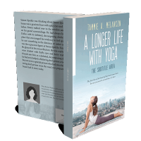 “A woman performs a yoga pose outdoors on a mat with an urban cityscape in the background. Book title text occupies the upper part of the image.”