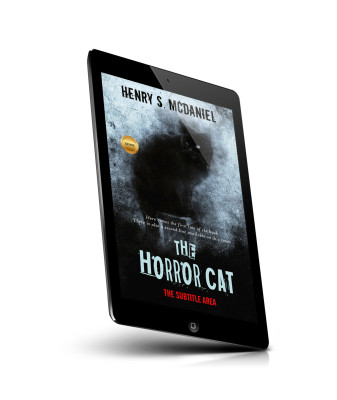 “A shadowy black cat with glowing eyes stands against a misty, eerie background on a book cover titled "The Horror Cat."”