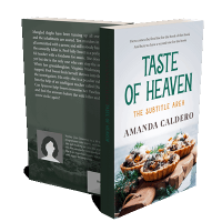 “Three savory tarts garnished with greens on a wooden board, under a title about food by Amanda Caldero.”