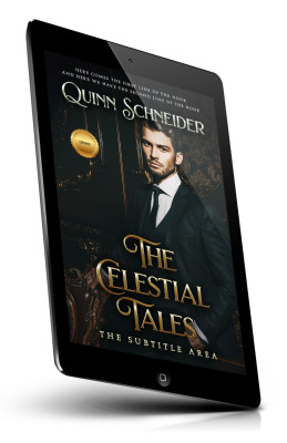 “A well-dressed man in a suit stands against an ornate, dark backdrop. Book title: "The Celestial Tales".”