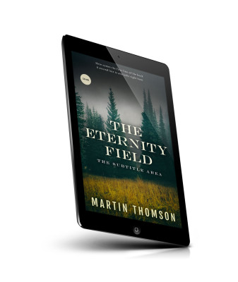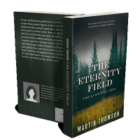 “Forest scene with misty trees and grassy foreground, featuring the book title "The Eternity Field" in bold white text.”