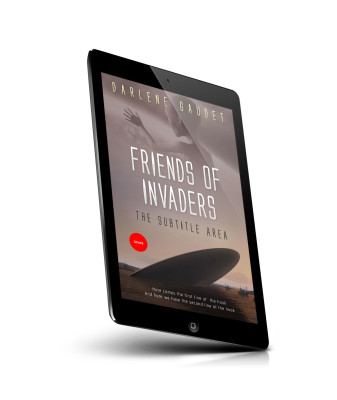 “A mysterious, futuristic landscape with a large, tilted structure and a hand reaching out in the background. Book cover titled "Friends of Invaders".”