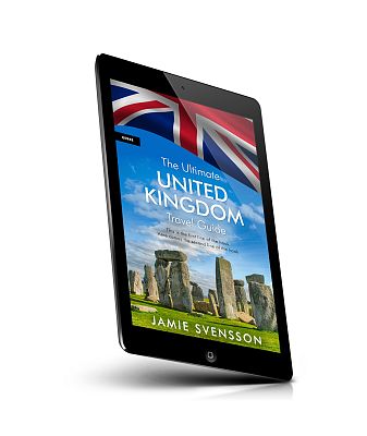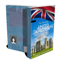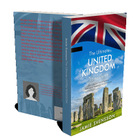 “Image of a travel guide cover featuring Stonehenge under a flag and a blue sky with clouds.”