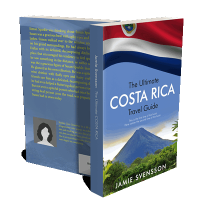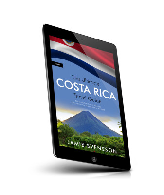 “A travel guide cover featuring a volcano, greenery, and a flag in the background. Title: "The Ultimate Costa Rica Travel Guide."”