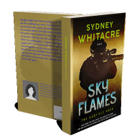 “A silhouette of an armed figure against a fiery backdrop with a bold, vibrant title in the foreground.”