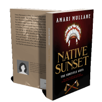 “A feathered headdress above bold text with crossed axes at the bottom. Dark red and black background.”